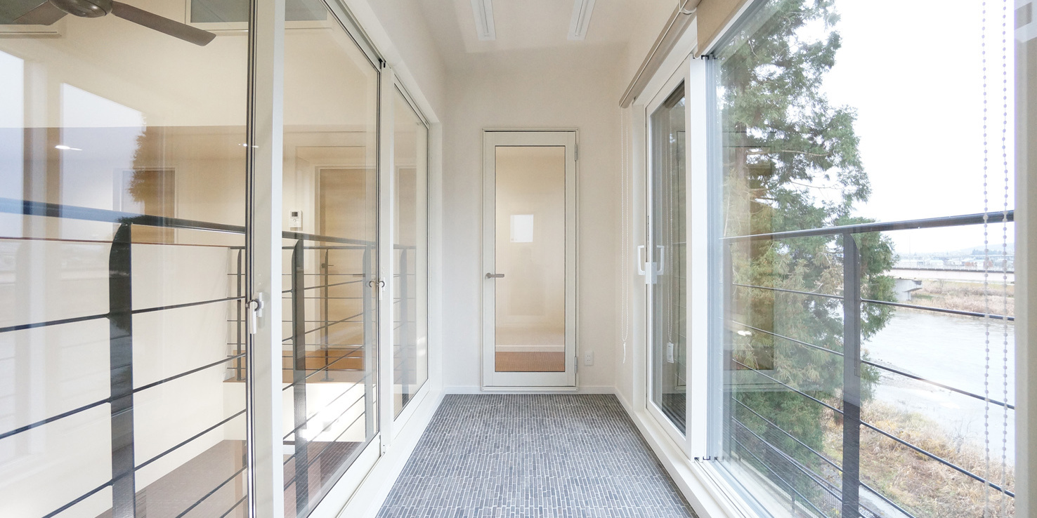 玄関や廊下などを吹き抜けにするデザインは魚沼エリアでも施工されていますが、リビング上を吹き抜けにして更に吹き抜け上階部を廊下にする事で吹き抜けの開放感を拡大させる。これがDENマジックです。